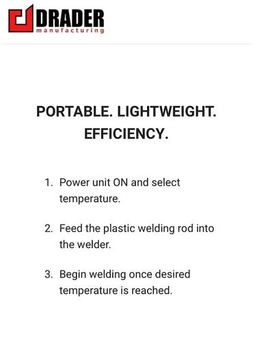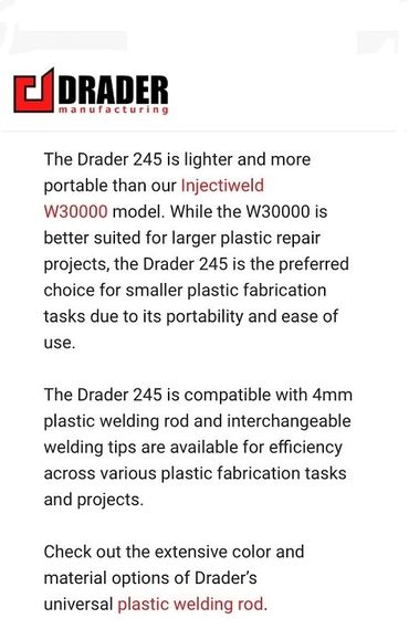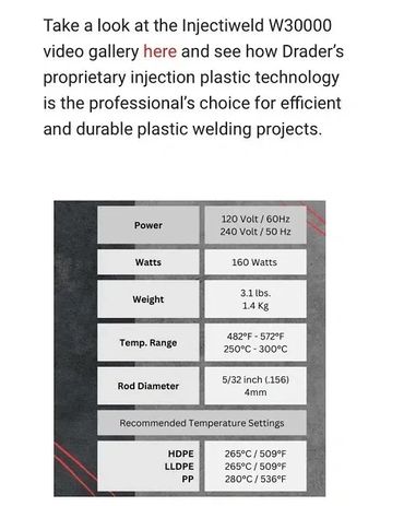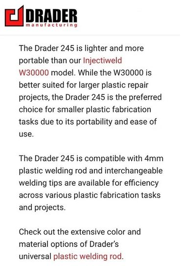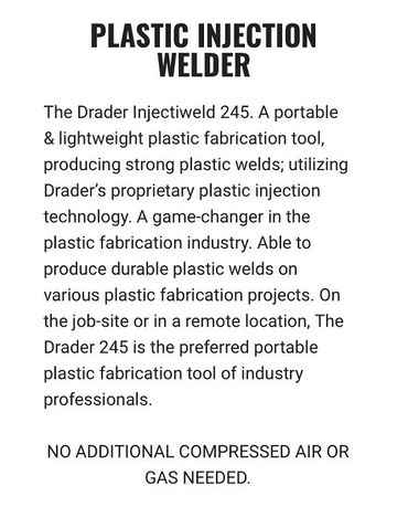 Drader manufactures plastic welding tools and supplies, including the unique Injectweld system known worldwide for its high quality weld and ease of use.